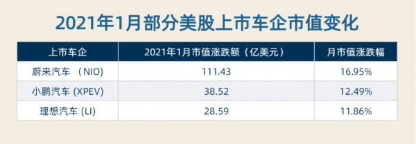 美股市场中,以蔚来汽车、小鹏汽车和理想汽车为代表的“造车三兄弟”2021年首月股价整体呈上涨趋势。其中,蔚来汽车(NIO)的股价以16.95%的涨幅领跑;小鹏汽车(XPEV)紧随其后,股价上涨12.49%;理想汽车(LI)的股价则上涨11.86%。