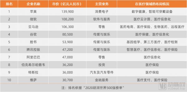 排名第三的亚马逊更是将“触角”伸向了更为广泛的医疗市场,医药电商、医疗保险、生物医药、远程医疗等核心板块均有涉足。
