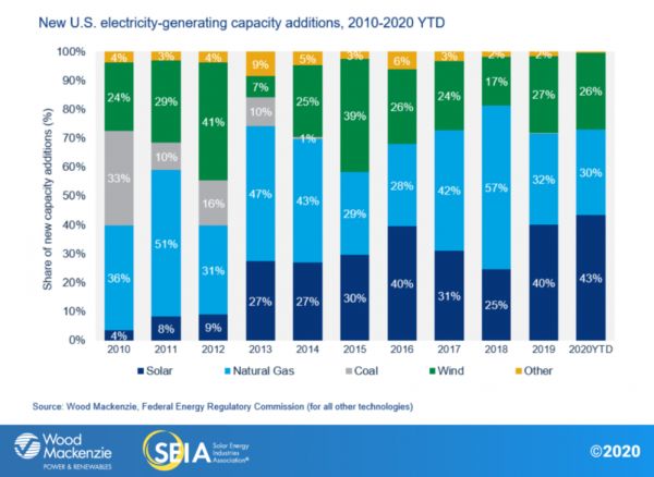 预计美国2020年新增发电中太阳能(深蓝色)占比将达到43%。图片来源:SEIA