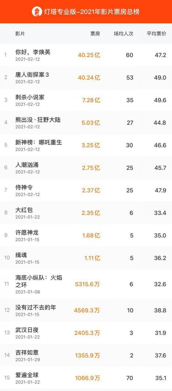 @北京日报【刚刚,《你好,李焕英》票房反超《唐人街探案3》】据灯塔实时数据,2月21日晚22时08分,《你好,李焕英》以40.25亿票房,反超《唐人街探案3》。数据显示,《唐人街探案3》票房为40.24亿。