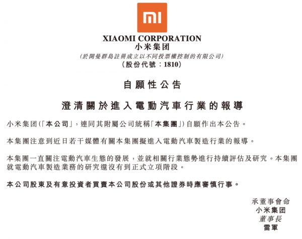 小米表示,本集团一直关注电动汽车生态的发展,并就相关行业态势进行持续评估及研究,本集团就电动汽车制造业务的研究还没有到正式立项阶段。