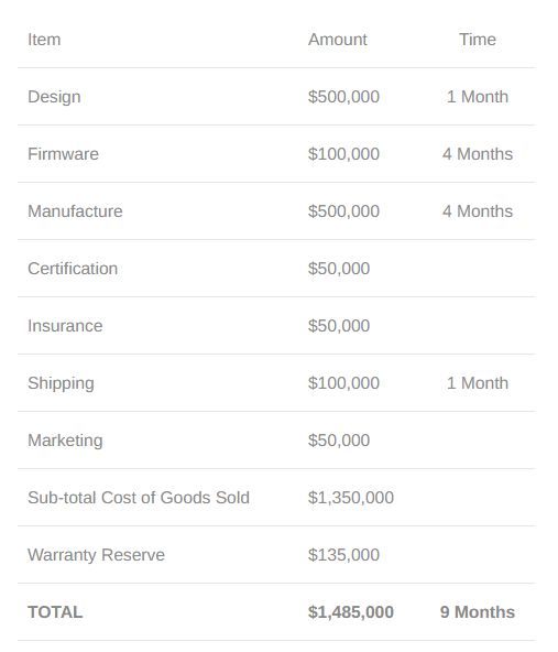 到目前为止,我们已经在设计上花费了50万美元和一个月时间,在固件上花费了10万美元和四个月时间。