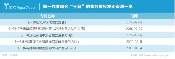 在专利领域,企查查数据显示,王莉作为著作权人参与的贵州茅台已授权专利共有35项。但其作为第一发明人的专利并不多,仅有14项,其中9项为外观专利,其余5项专利以检测方法为主。