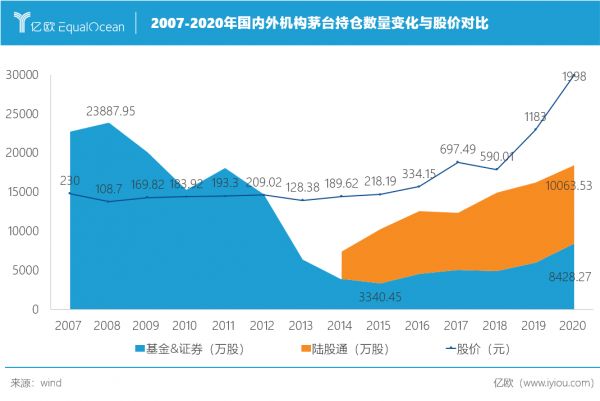 国内机构曾在2008年后持续减持茅台,持有量最低一度跌破4000万股,2018年茅台股价暴涨后,受白酒热度高涨、食品基金销售好等因素,其持有量才逐步抬升至8000万股以上。相比之下,海外资金在2014年开放进场之后就持续加码茅台,其持股量与茅台股价呈现明显正相关。