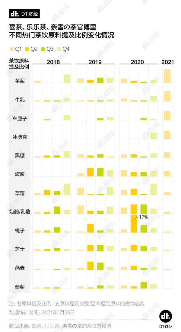 DT君采集了三家奶茶品牌的官博,将它们在微博中提及的热门奶茶元素按照时间进行梳理,确实发现了一些有意思的变化。