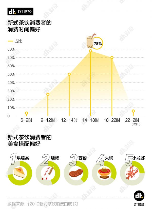 但与此同时,消费者更爱在下午和夜间点奶茶,再加上一份烘焙类食品,比如欧包、甜品,效果更佳。此外,配餐选择烧烤、火锅和小龙虾的用户也分别达到了44%、34%和25%。