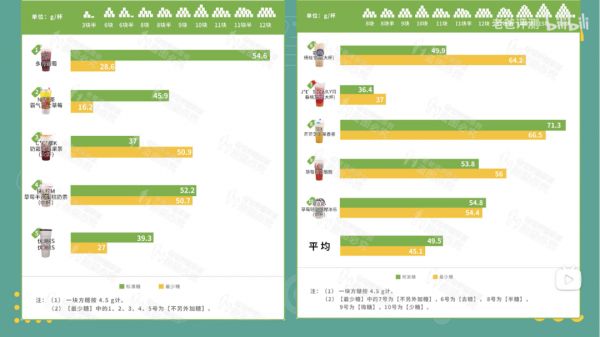 B站UP主老爸评测就曾对市面上数十家热门奶茶品牌的经典茶饮进行测评,对标准糖和最少糖的各类奶茶进行化学分析后发现,只有3款饮品的最少糖相对于标准糖有着明显的糖分下降,有将近一半糖分几乎没有差别,甚至还有各别选手最少糖的糖分比标准糖还高。