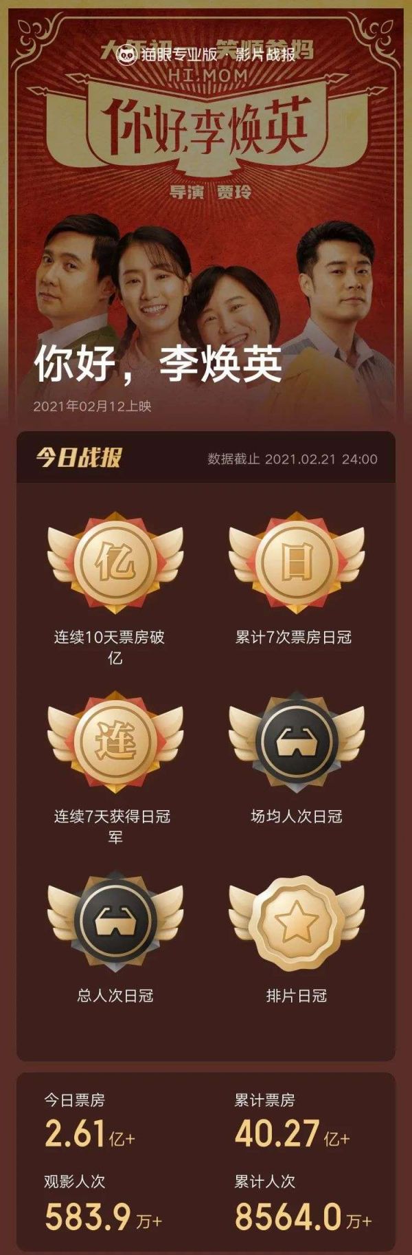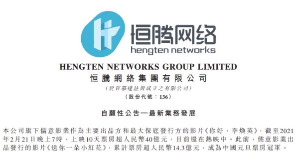 昨日晚间,恒腾网络公告称,旗下儒意影业作为主要出品方和最大保底发行方的影片《你好,李焕英》,截至2月21日晚上7时,上映10天票房超40亿元。