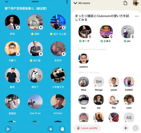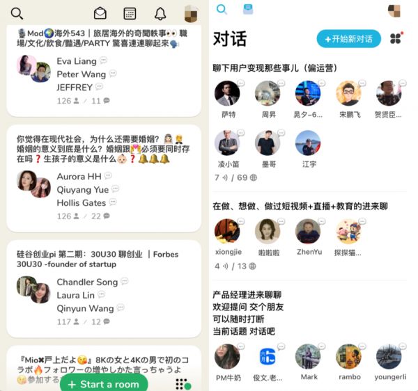左为对话吧聊天界面,右为Clubhouse聊天界面
