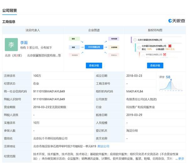 天眼查信息显示,北京大眼星空科技有限公司成立于2018年3月23日,注册资本为100万元,它由北京星云创迹科技有限公司100%控股。