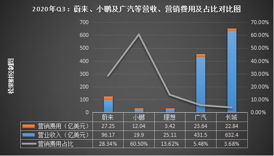 就拿蔚来、理想等造车新势力为例,它们的营销费用占比却远远高于广汽与长城等传统车企。