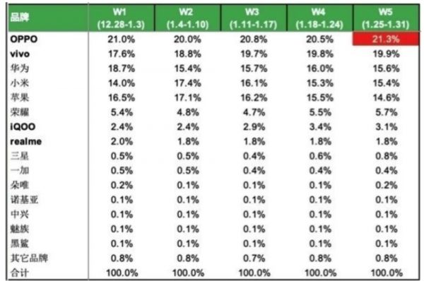 根据数据调研机构 BCI 的数据公布,2021 年 1 月第 5周中国手机品牌出货量排行榜显示,华为已经失去榜首位置,以 15.6% 获得季军。放在华为如日中天的那段时间,这是不可想象的数据。