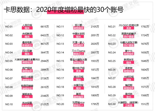 01 从2020年度涨粉最快的30个账号来看:剧情/搞笑类仍占比最多,达11席,其次是媒体账号,占比8席。而剩余的11个账号,则分布在:影视娱乐、美食、医疗/健康、汽车、音乐等赛道。卡思特别盘点了2019年增粉最快的TOP30账号,发现:除媒体外,增粉最快的30个账号无一进入到了2020年TOP30名单中;