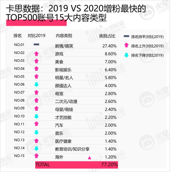 相同的是:剧情/搞笑类账号仍表现“坚挺”,占比虽有下滑,仍高达27.4%(2019年该数据为31.66%);不同的是:一,内容更为细分,2019年,前15大内容类型占据了TOP500涨粉账号的95.75%,但到2020年,这一数据降至77.2%,这说明:还有更多细分领域的账号处于涨粉快轨;二,在泛娱乐、泛生活之外,相比于2019年的“美妆”赛道表现抢眼,2020年,取而代之的是游戏、医疗健康和汽车3个领域。