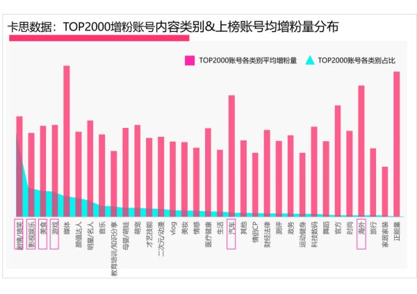 04 卡思重点分析了增粉最快的2000个账号,发现:剧情/搞笑类账号仍是当之无愧的增粉“王者”,占据2000个账号的23.9%。除“剧情”外,满足用户宅家娱乐需求的影视/娱乐、美食、游戏类账号也在疫情期间超速起飞。值得一提是,汽车类账号虽在TOP2000增粉账号中占比不高,但是上榜账号的均增粉势能却不容小觑;