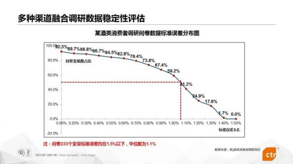 以CTR执行的某酒类消费者调研项目为例,通过大数据抽样框,项目融合了各渠道样本量共计1215个,问卷中233个变量平均值的标准误差均在1.5%以下,中位数为1.1%。可以看出,这项融合调研数据的稳定性是非常高的。