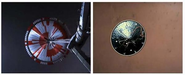 左图为“毅力号”打开的降落伞;右图为脱落的隔热罩