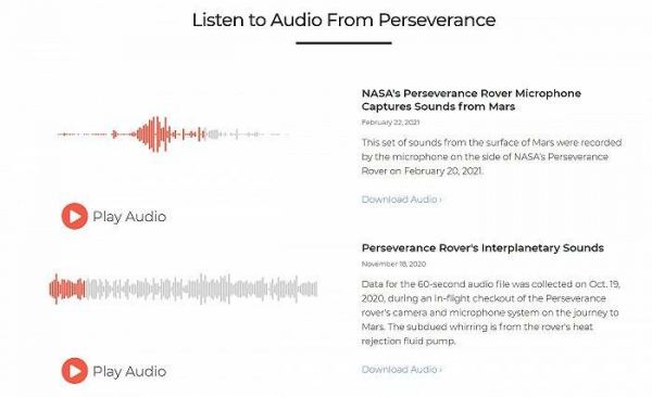 除了携带EDL相机系统拍摄画面外,“毅力号”上还安装了麦克风捕捉火星的声音。NASA也在网站上公布了两段来自火星的音频,可以隐约听到火星上的微风声:https://mars.nasa.gov/mars2020/multimedia/audio/