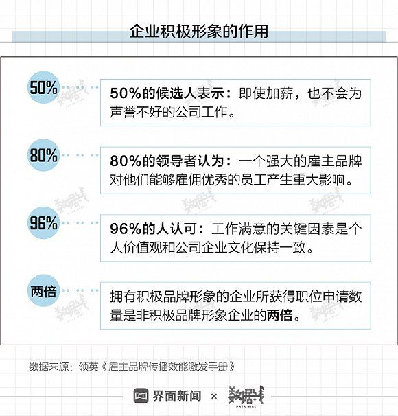 不仅跨国企业不再是优秀人才的首选,一些高薪职业也正在被候选人“唾弃”。50%的候选人表示,就算加薪,也不会为声誉不好的公司工作。在后互联网时代商业,世界充满易变性、不确定性、复杂性、以及模糊性,企业的积极形象不再虚无缥缈和无足轻重。