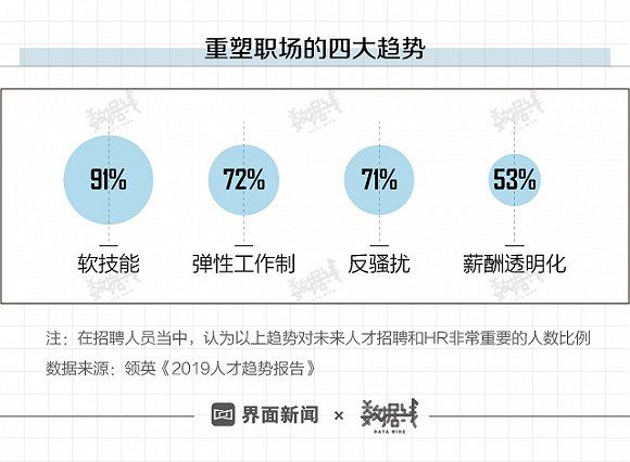 当外企、高薪正在褪去光环,今天的职场正在发生什么样的变化?领英通过对全球35个国家的专业人士进行调研,形成了《全球人才趋势报告》并揭示出2019年全球人才的四大趋势,即软技能、弹性工作制、反骚扰和薪酬透明化。