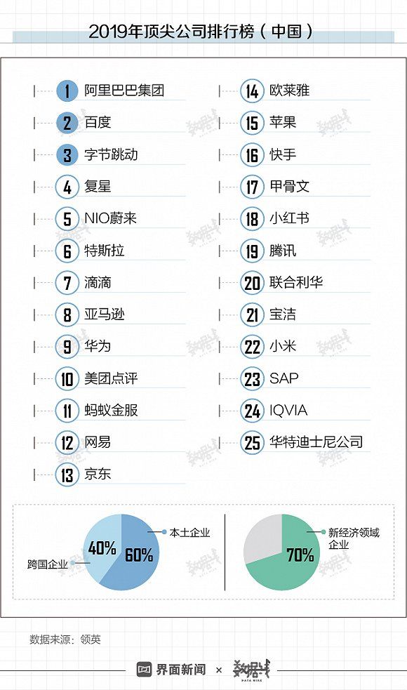 2019年4月3日,职场社交平台LinkedIn(领英)在中国首次发布“顶尖公司排行榜”(榜单基于全球超过6.1亿会员的实际行为数据,以求职者覆盖面、参与度、职位关注度和员工留存度四个维度分析得出)。在25家上榜公司中,阿里巴巴、百度、字节跳动、复星和NIO蔚来位居榜单前五。同时,位于榜单前五的企业总部均位于中国。