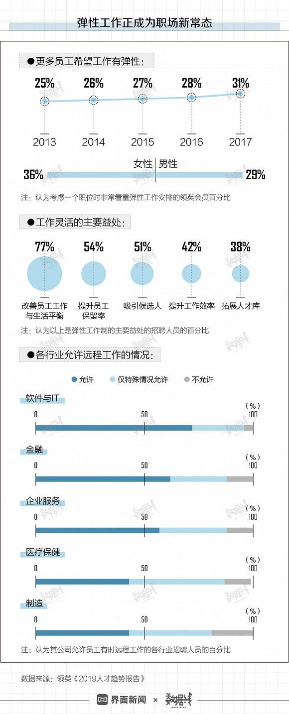 《2019人才趋势报告》显示,越来越多的员工希望工作能有弹性。能够提供弹性工作的企业,或许能更好地留住顶尖人才。