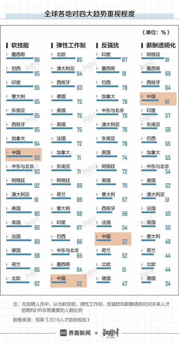 软技能、弹性工作制、反骚扰和薪酬透明化,这四大趋势正在深刻地影响全球职场。但每个国家和地区的人才趋势也因当地实际情况不同而侧重点不同,比如中国职场人士对于软技能和对薪酬透明化的期待高于全球水平。但同时,中国在弹性工作制上最重视程度最低。