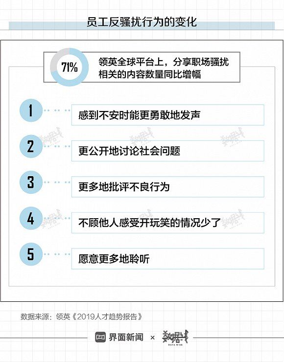 性骚扰一直困扰着职场,任何地区、行业、收入阶层都不能幸免。根据《2019人才趋势报告》数据,在领英全球平台上,分享职场骚扰相关内容的数量同比增长71%。性骚扰问题正在引发新的关注,员工反骚扰行为也发生了变化。