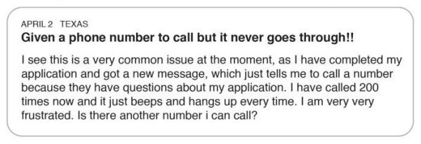 帖子内容:(得克萨斯州,4月2日)我发现这是普遍存在的问题。当我提交申领失业金申请过后,我收到一条信息,称我的申请有些问题,并提供了一个电话号码,让我打电话过去。我打了差不多200通电话,但每次铃响过后都没有人接听电话。我非常沮丧,还有其他能打通的电话吗?