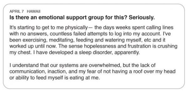 帖子内容:(夏威夷州,4月7日)现在对我造成了身体上的影响。数日数周致电无人接听,无数次尝试登录账号失败。我一直保持着运动、冥想、进食和饮水等,目前一切都比较正常。但这种无助感和沮丧感却让我难以呼吸,很明显的是,我睡眠规律也因此被打乱了。我知道这套系统不堪重负,但无法沟通解决问题,担心没地方住,以及担心没东西吃,让我感到非常愤怒。