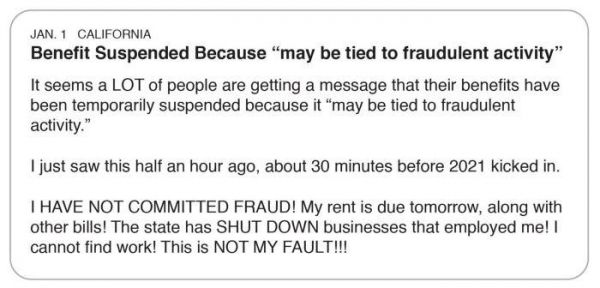 帖子内容:(加利福尼亚州,1月1日)似乎许多人都收到这样一条消息,称由于“可能存在欺诈活动”,因此会暂缓发放福利。我差不多半小时前收到这条信息的,这半小时一过就步入2021年了。我没有涉嫌欺诈行为!我明天要交房租了,还有其他账单要支付!州政府强制关停了辞退我的雇主!我找不到工作!这不是我的错!!!