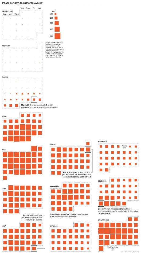 2020年1月至2021年1月Reddit平台失业版块每日新增发帖数量。其中,从小到大的五个红色方框分别代表100、250、500、750和1000条发帖数量。图片来源:The New York Times