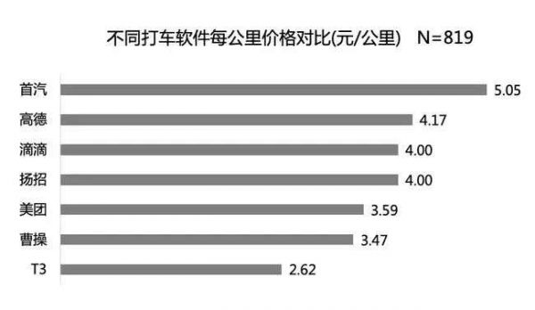根据复旦大学教授孙金云研究团队所做调查,滴滴均价 4.17 元每公里的价格排在了打车软件(首汽、高德、滴滴、扬招、美团、曹操、T3)的第三位,而在高德、首汽、美团中,滴滴的实付价比预估价平均高了6.7%。