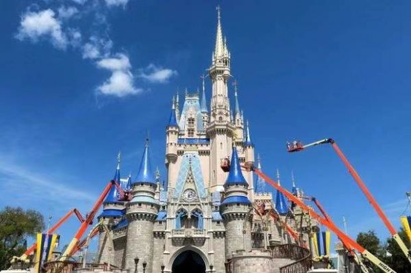 迪士尼旗下乐园因疫情被关闭的当天,工人们还在粉刷城堡
