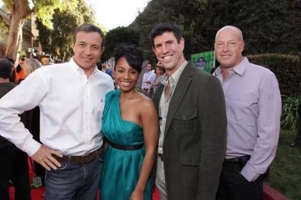 2009年电影《公主与青蛙》的首映式上,艾格(左)和查佩克(右)与女演员安妮卡·诺妮·罗斯(Anika Noni Rose)以及迪士尼高管里奇·罗斯(Rich Ross)在一起。
