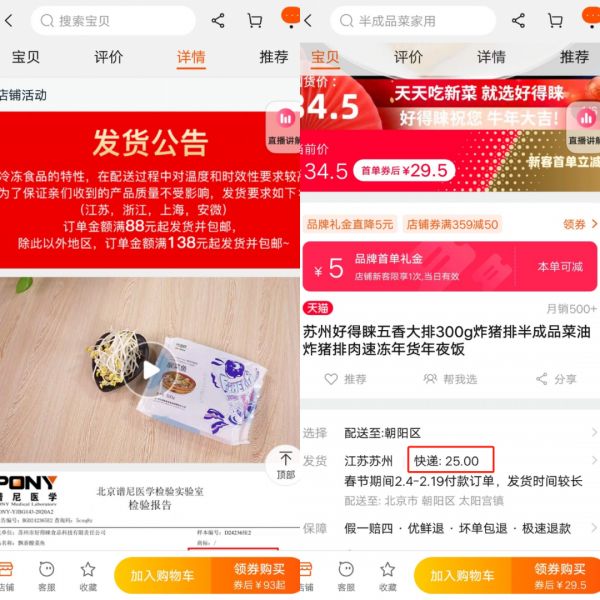 铅笔道在淘宝上搜索预制菜,发现部分品牌规定,订单金额满88元才能包邮。如果未达到包邮价格,消费者需要支付高达25元的运费。