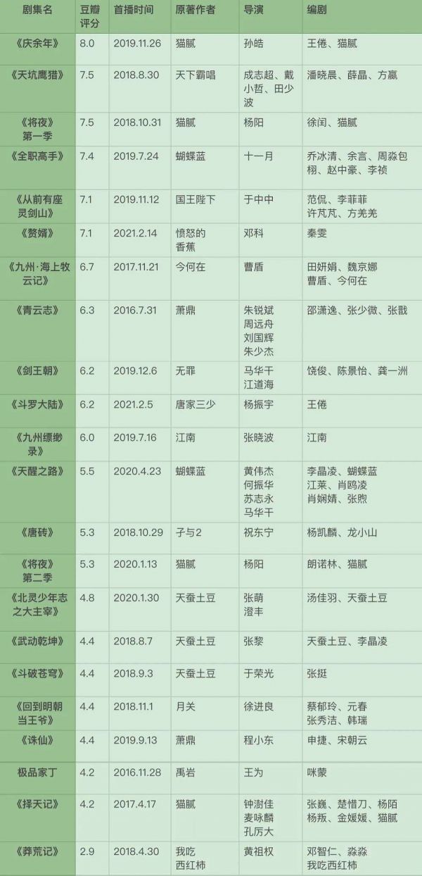(注:未收录“鬼吹灯”及“盗墓笔记”系列作品)近年来主要男频IP剧集 豆瓣评分及相关信息