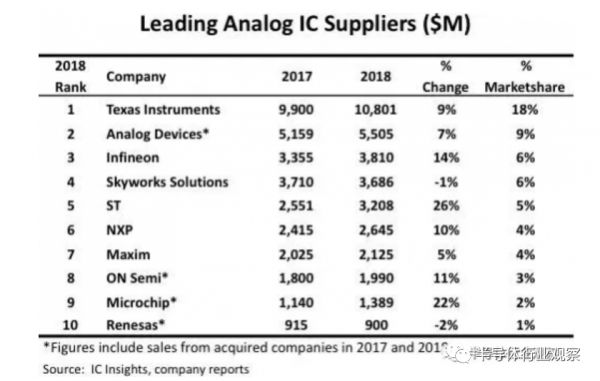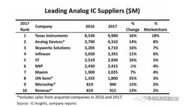 ICinsights统计的2017、2018两年的数据当中,这前十大模拟芯片企业也并没有太大的变化——TI、ADI依旧稳居模拟市场前两名,全球前十大模拟芯片厂商没有一人出局。