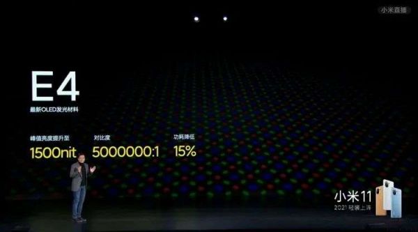 但时至今日,E3早已不是最先进的屏幕方案。2020年12月底,小米11首发了全新的E4 AMOLED屏幕材质。与E3相比,E4首先具备了更高的、可达1500nit的激发亮度,这使得其在阳光下的显示效果更佳,屏幕本身看起来会更通透。与此同时,和E3相比,E4材质的功耗进一步下降,不仅延长了手机的续航能力,更重要的是它使得2K分辨率与120Hz高刷新率变得更容易实现。