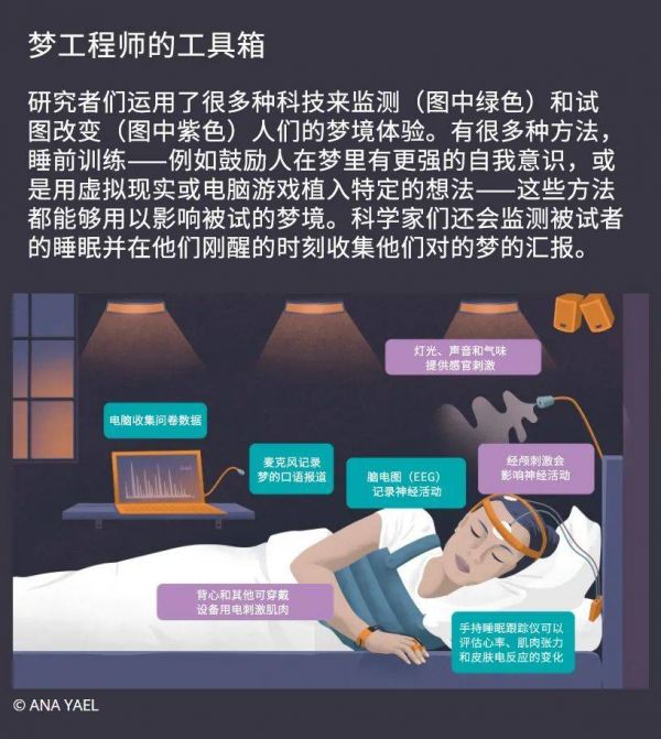 梦工程师希望通过引导清醒梦来研究这些感觉的产生机理以及它们对做梦者来说是否存在用处。非侵入式脑刺激就是其中一种备受关注的操控梦境感知的方法,它利用磁力圈或在头皮上安装电极来影响做梦者大脑的电活动。