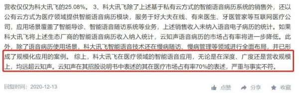 科大讯飞在回复中罗列了覆盖医院数量、相关收入以及其他应用场景,最终得出科大讯飞完胜,云知声医疗市场市占率70%的表述“严重与事实不符”的结论。