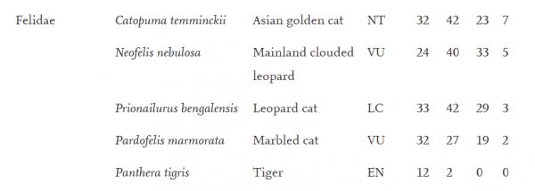 Rasphone研究报告中猫科动物在四个分区内的观测记录,苏门答腊虎的14次观测均发生在2013年 / 网页截图