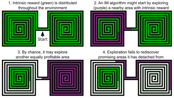 所以,在完成右边的搜索后,智能体并不记得在左边迷宫中探索的事情,更糟糕的情况是,左边迷宫前期的一部分区域已经被探索过了,因而几乎没有可获得的内在奖励去刺激智能体深入探索。研究人员将这种状况总结为:算法从提供内在动机的状态范围分离开了。当智能体认为已经访问过这些区域了,深入探索行为可能就会停滞,因而错过那些仍未探索到的大片区域。