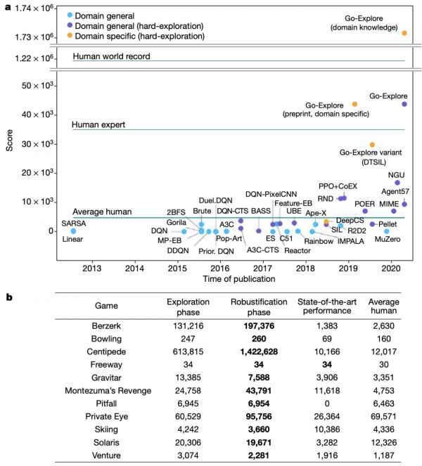图|Go-Explore 在 Atari 平台游戏中的强力表现(来源:Nature)