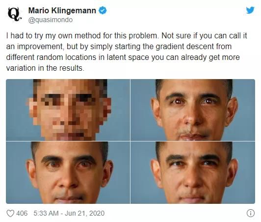 倘若事情到此为止,也就没有什么特殊性可言,但事情不是那么简单。在对LeCun的批评声音中,一部分学者指责其片面地理解AI的公平性。譬如AI艺术家Mario Klingemann就认为,问题的出现应该归因于PULSE在选择像素的逻辑上出现了偏差,而不全是训练数据的问题。他强调自己可以利用StyleGAN将相同的低分辨率奥巴马的照片生成非白人特征的图像。