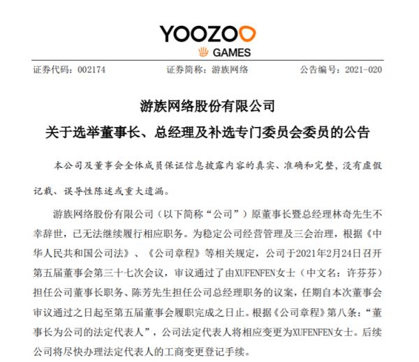 2月24日晚间,游族网络发布关于选举董事长、总经理及补选专门委员会委员的公告。公告称,公司在当天召开的董事会会议上审议通过了由XUFENFEN(中文名:许芬芬)担任公司董事长职务、陈芳担任公司总经理职务的议案。