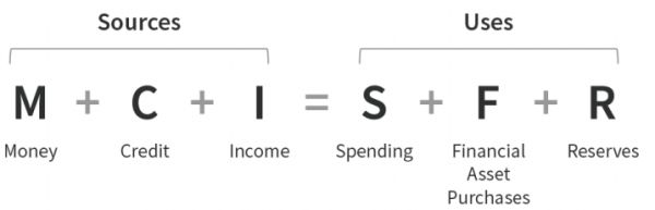 尽管疫情非同寻常,政策应对也很新颖,但其影响可以通过经济来源和资金使用的方式来理解。对于任何实体来说,其资金来源必须与其资金用途对等,而对于一个经济体来说,资金来源和资金用途需要采取以下的形式。