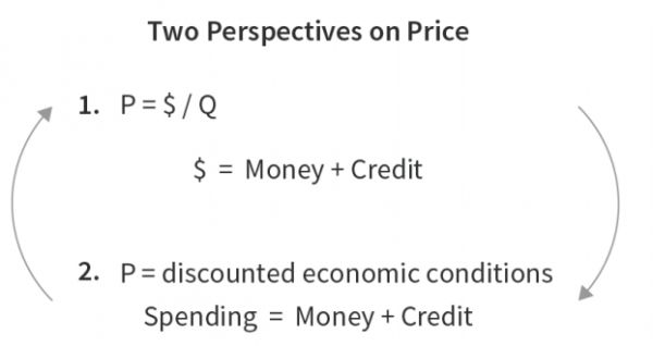 对投资而言,最重要的是价格如何形成,以及一旦形成,它对于未来意味着什么。我们已经多次使用下面的图表来传递这些关键的构建要素。它的意思是价格是由货币与数量的交换形成的,一旦价格形成,它就意味着对未来经济情景的折现。这个系统的动力是货币和信贷,它们是交易定价的资金来源,也是为以价格折现的支出融资的资金来源。