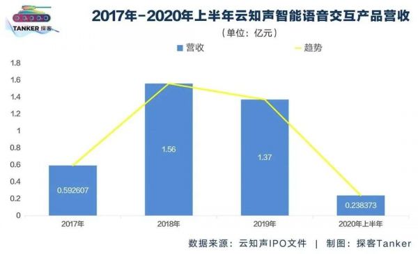 从数额上来看,云知声智能语音交互产品2017年至2019年与2020年上半年的营收分别为5926.07万元、1.56亿元、1.37亿元、2383.73万元,先增后降。云知声表示,该板块收入下滑主要原因是智能语音模组出货量大幅下降。