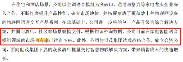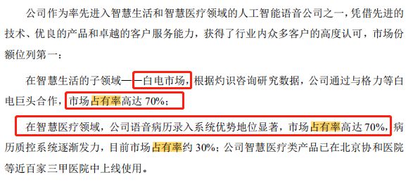 此次爆发争议的,就是招股书中关于市场占有率的问题。云知声援引灼识咨询数据称,其通过与格力等白电巨头合作,市场占有率高达70%;在智慧医疗领域,其语音病历录入系统优势地位显著,市场占有率高达70%,病历质控系统逐渐发力,目前市场占有率约30%。